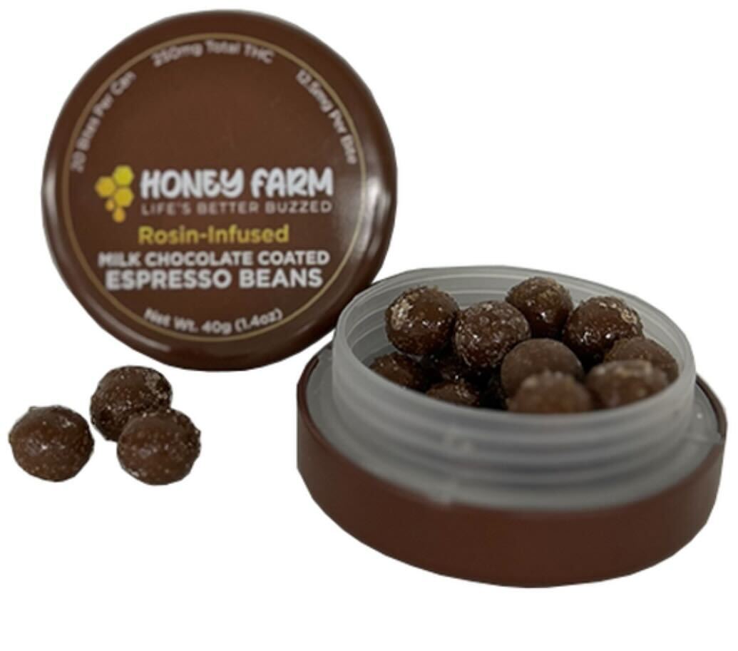 Honey Farm milk chocolate rosin-infused espresso beans offer a smooth, comforting combination of creamy milk chocolate and roasted espresso beans, infused with high-quality solventless rosin. This approachable formulation is crafted for medical patients seeking a gentle, palatable option with reliable cannabinoid content.