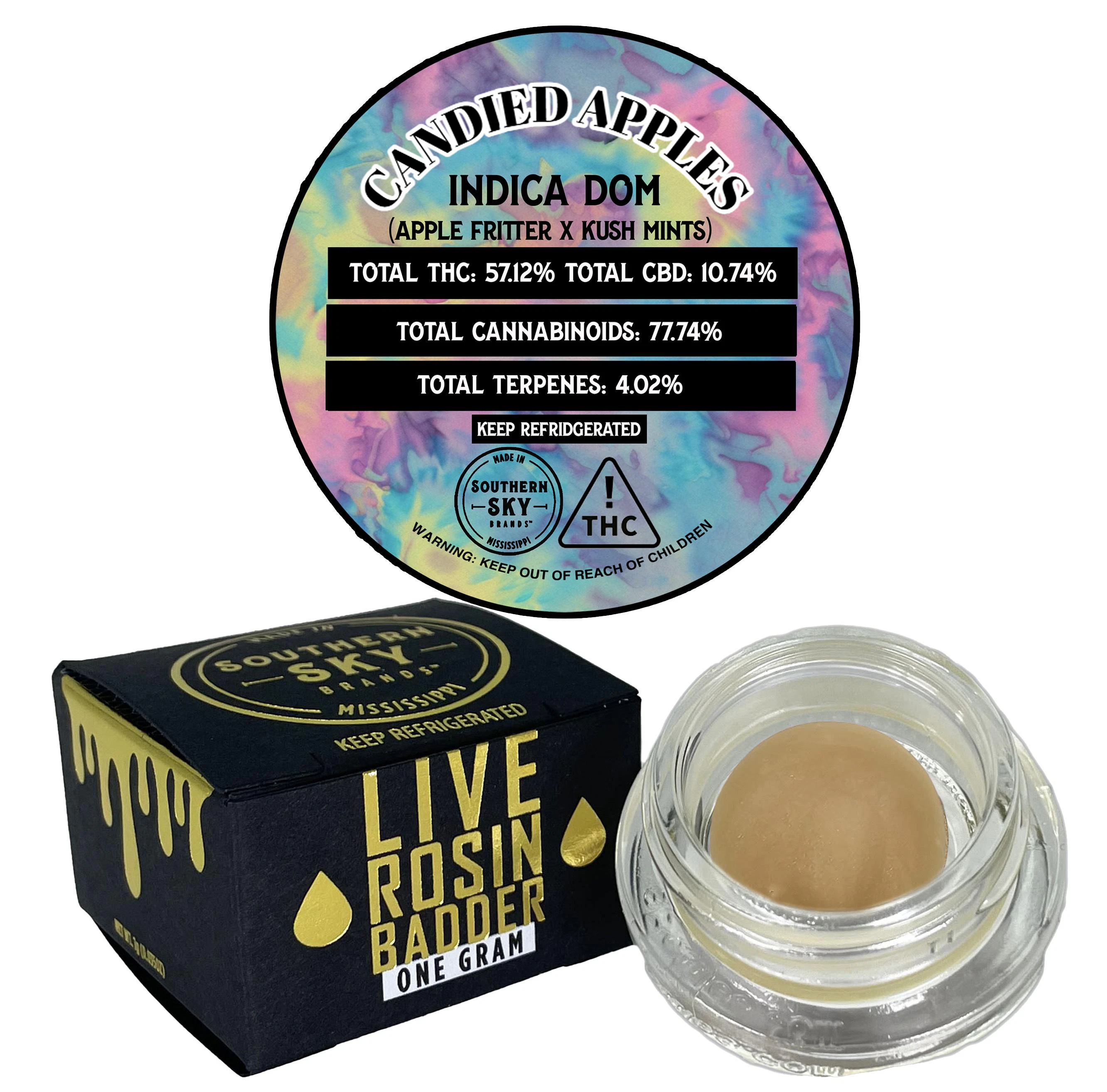 "This product is Live Rosin. We harvested and froze our in-house, indoor-grown flower. We washed that flower in ice water and dried the resulting Bubble Hash in a pharmaceutical-grade freeze dryer. The only time this Bubble Hash was ever exposed to heat was when we loaded it into a micron bag and pressed it between two hot plates. This traps the "skins" of the Bubble Hash in the bag and pushes out the "juice" within the Bubble Hash so we can collect it. That juice - Rosin - was loaded it into jars. This is a solventless product made without chemicals - only water, ice, heat, and pressure. We are excited and proud to bring a high-quality Live Rosin product to Mississippi medical patients." - Charles Thompson, Lab Director for Southern Sky Brands