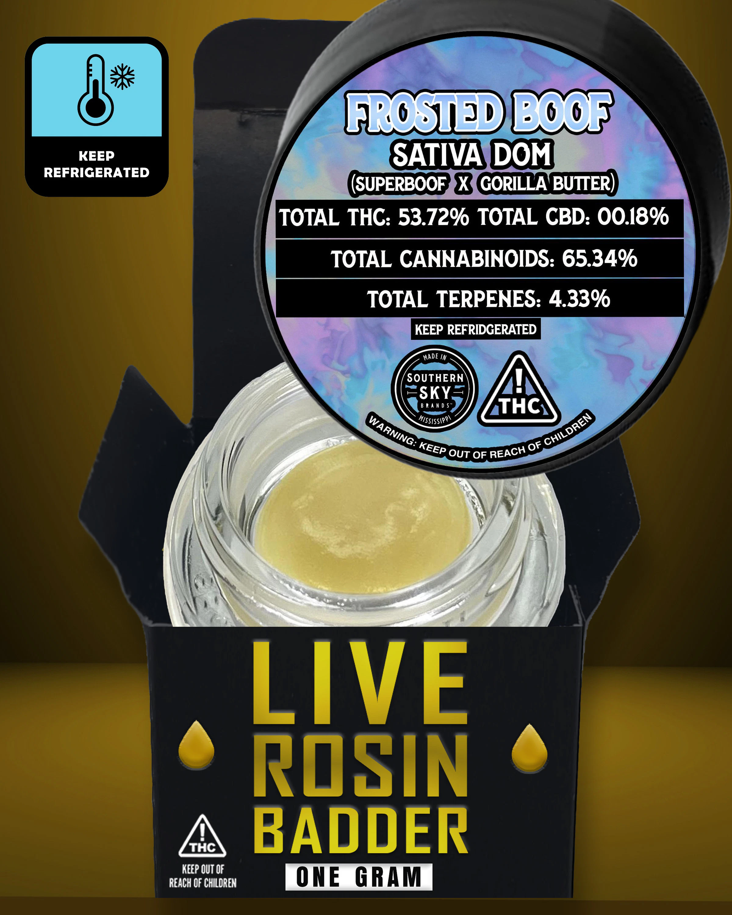 "This product is Live Rosin. We harvested and froze our in-house, indoor-grown flower. We washed that flower in ice water and dried the resulting Bubble Hash in a pharmaceutical-grade freeze dryer. The only time this Bubble Hash was ever exposed to heat was when we loaded it into a micron bag and pressed it between two hot plates. This traps the "skins" of the Bubble Hash in the bag and pushes out the "juice" within the Bubble Hash so we can collect it. That juice - Rosin - was loaded it into jars. This is a solventless product made without chemicals - only water, ice, heat, and pressure. We are excited and proud to bring a high-quality Live Rosin product to Mississippi medical patients." - Charles Thompson, Lab Director for Southern Sky Brands