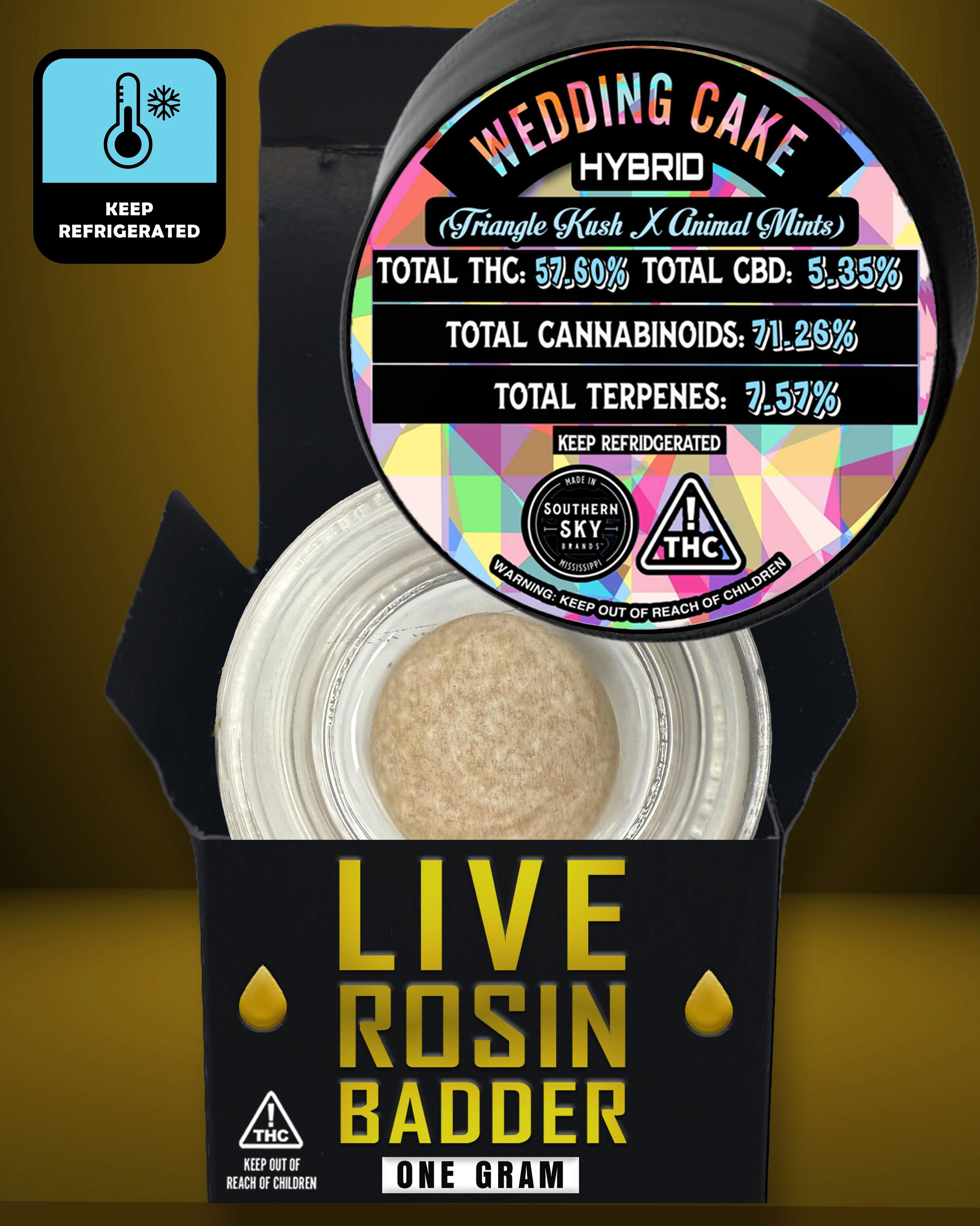 "This product is Live Rosin. We harvested and froze our in-house, indoor-grown flower. We washed that flower in ice water and dried the resulting Bubble Hash in a pharmaceutical-grade freeze dryer. The only time this Bubble Hash was ever exposed to room temperatures was when we loaded it into a micron bag and pressed it between two hot plates. We collected the extruded product - Rosin - and loaded it into jars. This is a solventless product made without chemicals - only water, ice, heat, and pressure. We are excited and proud to bring a high-quality Live Rosin product to Mississippi medical patients." - Charles Thompson, Lab Director for Southern Sky Brands