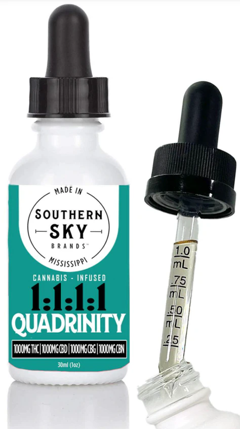 This tincture is 30ml and designed for 30x 1ml doses, each containing ~30mg THC, ~30mg CBD, ~30mg CBG, and ~30mg CBN. The dropper shows graduated markings for easy self-dosing.